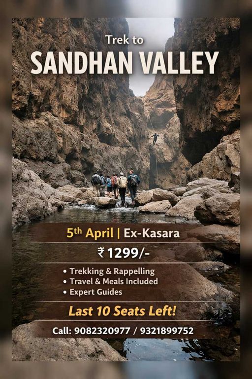 Shramik Chavan2h·⛰️ SANDHAN VALLEY TREK ⛰️ 🔥 Last 10 Seats Remaining! Ready to explore the Grand Canyon of Maharashtra? 🌄 Experience a thrilling trek with water patches, rappelling & full adventure vibes 💯 📅 Date: 5 April 📍 Ex-Kasara 💰 Cost: ₹1299/- ✅ Includes00 comments46 viewsLikeCommentShare